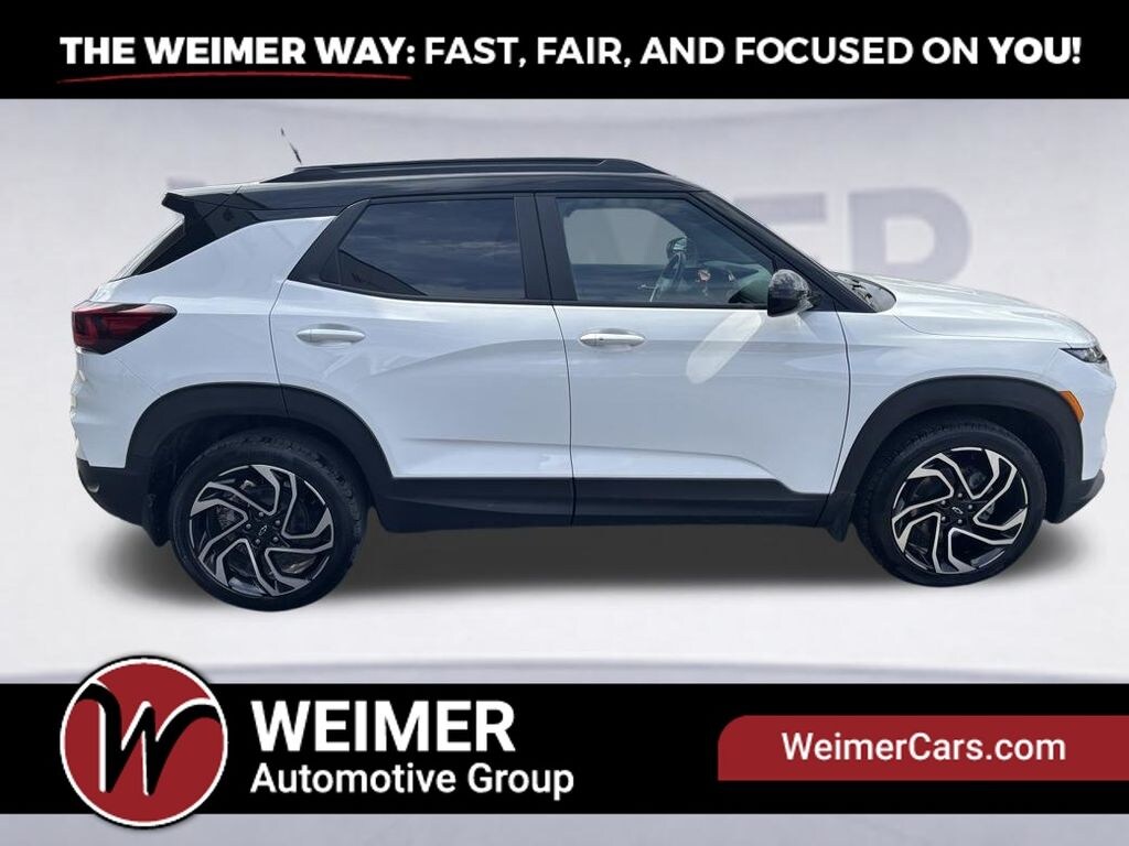 The stunning White exterior, complemented by the Mosaic Black Metallic Two-Tone Roof, gives this TrailBlazer RS a bold and distinctive appearance that's sure to turn heads wherever you go. The 19-inch High Gloss Black Machined Aluminum wheels add a touch of sophistication, while the rear spoiler enhances the overall aerodynamic profile.